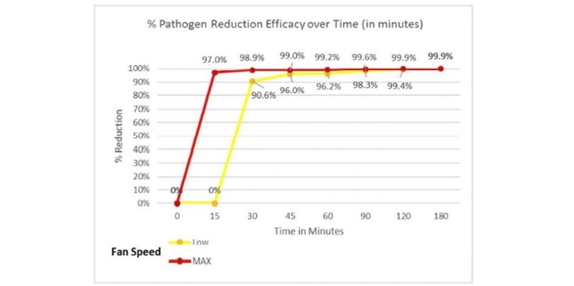 Our technology was tested at Intertek. An aerosolized pathogen, Phi X174, (SARS-CoV-2 surrogate) was released in a standard 1,000 cubic foot testing chamber. The technology was found to achieve a 99.9% reduction for the challenge virus. A dramatic reduction of 97.2% was evident within the first 5 minutes of use.